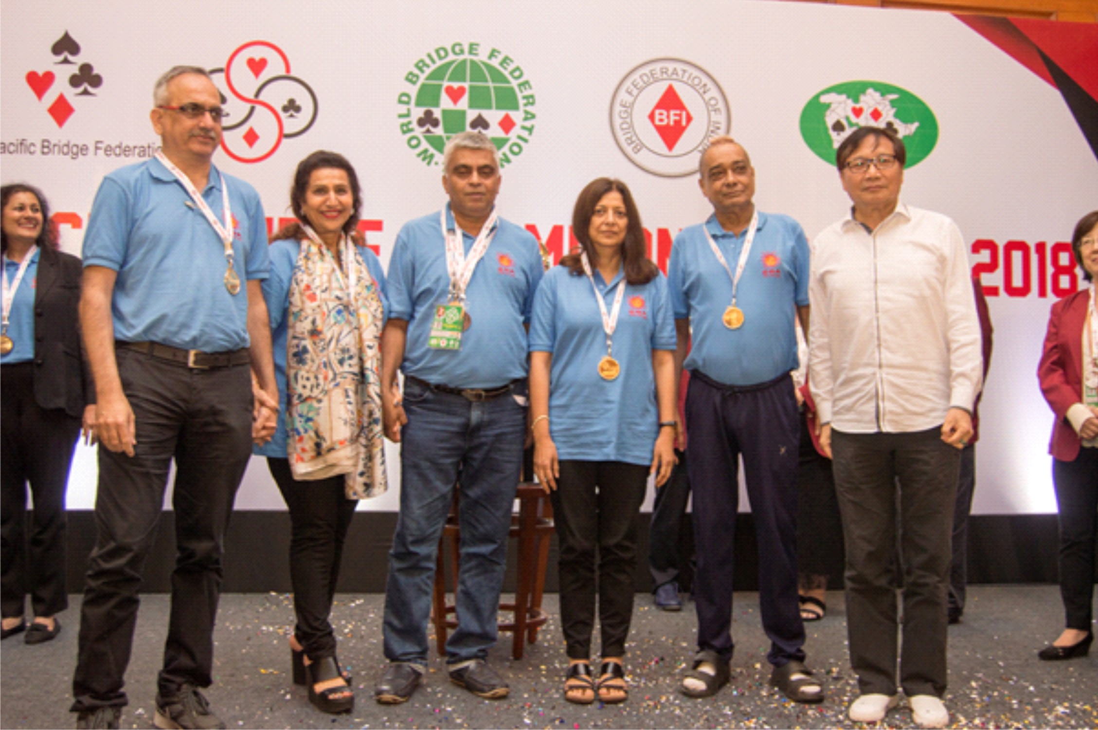 Finton (second from right), along with Subhash Bhavnani, Aparna Sain, Vinay Desai and Feroza Chothia, winners of the 2018 Asia Cup, Super Mixed Teams Title